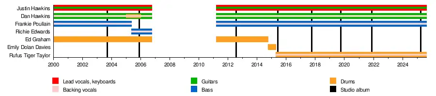 The Darkness are a British hard rock band formed in Lowestoft in 2000. The band consists of the Hawkins brothers Justin Hawkins (vocals, guitar) & Dan Hawkins (guitar), Frankie Poullain (bass) and Rufus Tiger Taylor (drums).