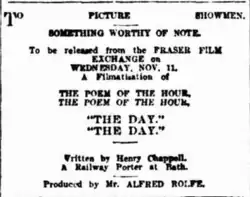The Day is a 1914 Australian silent film directed by Alfred Rolfe.[3] It is a propaganda film about German brutality in Europe during World War I. It is considered a lost film.[4]