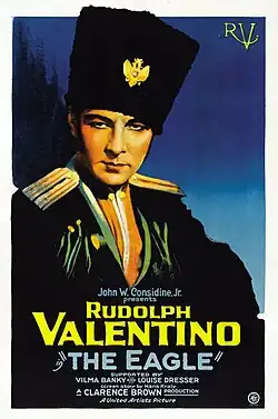 The Eagle is a 1925 American silent drama film directed by Clarence Brown and starring Rudolph Valentino, Vilma Bánky, and Louise Dresser.[1] Based on the posthumously published 1841 novel Dubrovsky by Alexander Pushkin,[2] the film is about a lieutenant in the Russian army who catches the eye of Czarina Catherine II. After he rejects her advances and flees, she puts out a warrant for his arrest, dead or alive. When he learns that his father has been persecuted and killed, he dons a black mask and becomes an outlaw. Black Eagle does not exist in the novel and was inspired by the performance of Douglas Fairbanks as Zorro in The Mark of Zorro.[3]
