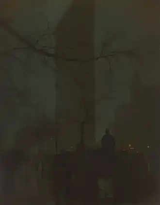 The Flatiron is a colored photograph made by Luxembourgish American photographer Edward Steichen. The photograph depicts the recently erected Flatiron Building in New York, taking inspiration from fellow photographers like Alfred Stieglitz, who had just photographed the building a year prior.[1]: 187  The original negative was made in 1904 and spawned three platinum-gum exhibition prints in brown (1905), blue-green (1909), and yellow-green-black (1904–1909; uncertain).[2]: 24