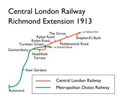 The station was to have been built on the CLR's planned underground extension from Shepherd's Bush to Gunnersbury proposed to parliament in November 1912.[1] The extension was to continue on the London and South Western Railway (L&SWR) surface tracks to Richmond already used by the District Railway (DR). The station would have been between Paddenswick Road to the west and Shepherd's Bush to the east.[2]
