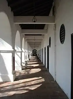 In 1957, a serviceman named Bill Runyan painted heroic murals depicting Spanish settlement of the area[5] on selected interior walls of The Hacienda. Runyan started the large murals when he was a soldier at the fort but stayed on as a civil service carpenter to complete the task. Smaller ornamental paintings in the hotel date from the Hearst decade and were touched up or repainted by the Army.[6]