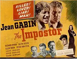 The Impostor (aka Strange Confession) is a 1944 American drama war film directed by Julien Duvivier and starring Jean Gabin.[1]