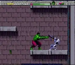 In the summer of 1992, Mean Machines writers Richard Leadbetter and Julian Rignall were invited by U.S. Gold to create the scenario for a Hulk-based video game. Leadbetter and Rignall agreed upon the general premise of "trashing tanks, doing mile-long jumps and generally indulging in all-out warfare with all and sundry". However, Marvel Comics objected to the prospect of killing humanoid characters, which influenced the final game's robotic enemies.[8] Development was initiated by Probe Software in December 1992.[8] The levels were designed by Nick Baynes, and the graphics were created by Eric Bailey, with Anthony Rosbottom providing additional graphics for the Game Gear version.[9][10][11] Matt Furniss composed the music for the Sega versions,[9][10] which was adapted to the SNES version by Steve Collett.[11]