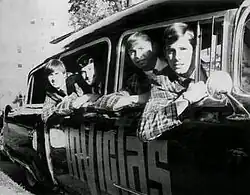 The initial lineup consisted of the leader Gross on guitar and vocals, Bruce Hickey on guitar, and Dave Hickey on drums.[2] In 1961, while Gross was attending the Rochester Institute of Technology, he expanded the band to include Jim Kohler on bass and Mark Blumenfeld on lead guitar. The band renamed themselves the Invictas.[2] The name was inspired by the Buick car of the time known as the Invicta, meaning "invincible" in Latin.[2] The Invictas, who used a black hearse with their band logo painted on the side to haul equipment and travel from gig to gig, became a regular fixture at Tiny's Bengal Inn, a local club.[1]