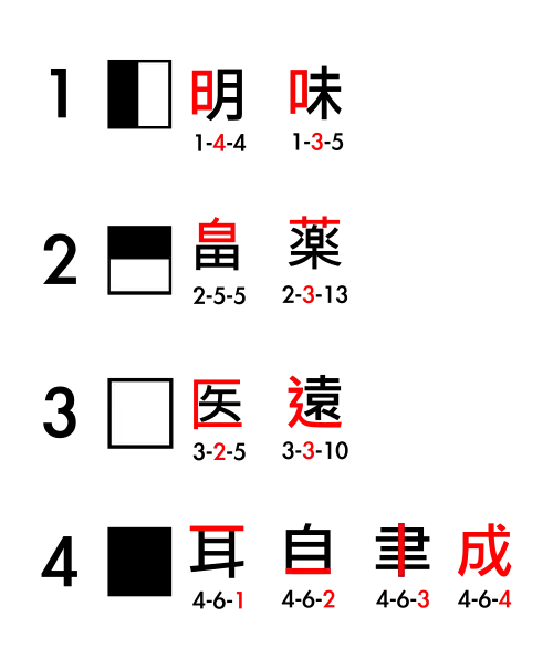 - Others – Kanji which cannot be placed in the preceding sub-patterns, e.g. 女 (woman) and 丸 (circle).