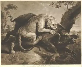 Aesop's original fable was made the subject of a painting by Frans Snyders which in the 18th century entered the collection of the dukes of Newcastle. Robert Earlom (1743-1822) made a mezzotint engraving of this in 1772, of which there are both hand-coloured [6] and plain versions.[7] In 1811, Samuel Howitt's independent treatment of the subject featured vultures circling above the combatants.[8] The plate was also bound into Howitt's A New Work of Animals, where it was accompanied by L'Estrange's version of the fable.[9] A new translation was published in 1867 by George Fyler Townsend, for which the illustrator was Harrison Weir.[10]