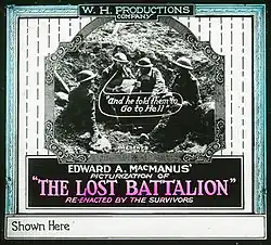 The Lost Battalion is a 1919 American silent war film about units of the 77th Infantry Division (the "Lost Battalion") penetrating deep into the Argonne Forest of France during World War I. The film was directed by Burton L. King and features Major Charles W. Whittlesey and a number of actual soldiers from the 77th who portrayed themselves in the film. It was released July 2, 1919 in North America. The film was remade in 2001 by Russell Mulcahy.