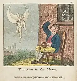 The man in the Moon is a character with a long history. He figures in medieval folklore as a peasant who has been banished to the Moon as a punishment for stealing thorns or brushwood.[3] He is the subject of one of the Middle English Harley Lyrics, "Mon in the mone stond and strit", dating from c. 1300.[4] He is also mentioned in Robert Henryson's Testament of Cresseid, in Shakespeare's The Tempest and A Midsummer Night's Dream,[3] in two old English ballads, and in a Jacobite song.[5] Not satisfied with this source material, Katherine Elwes Thomas, an American writer described by one modern commentator as "incomprehensibly imaginative",[3] interpreted the nursery rhyme as a commentary on the later career of the 16th century Scottish political figure Lord Bothwell.[6]