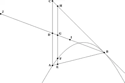 Suppose the line segment AC is parallel to the axis of symmetry of the parabola. Further suppose that the line segment BC lies on a line that is tangent to the parabola at B. The first proposition states:[1]: 14