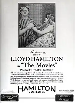 The Movies is a 1925 American comedy film starring Lloyd Hamilton and directed by Roscoe Arbuckle, who was working under the pseudonym "William Goodrich".[1] After a film star breaks his leg, the director replaces the actor with a country boy who resembles him.