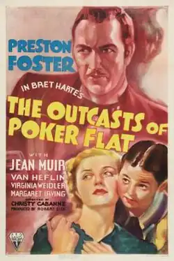The Outcasts of Poker Flat is a 1937 American Western film directed by Christy Cabanne and written by John Twist and Harry Segall. The film stars Preston Foster, Jean Muir, Van Heflin, Virginia Weidler and Margaret Irving. The film was released on April 16, 1937, by RKO Pictures.[1][2][3]