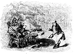 Only in a few instances did Dickens adjust his narrative to plates that had been prepared for him. Typically, he led the way with an instalment of his story, and the artist was compelled to illustrate what Dickens had already written. The story thus became the prime source of interest and the illustrations merely of secondary importance.[1] Seymour provided the illustrations for the first two instalments before his suicide. Robert William Buss illustrated the third instalment, but Dickens did not like his work, so the remaining instalments were illustrated by Phiz (Hablot Knight Browne), who illustrated most of Dickens's subsequent novels. The instalments were first published in book form in 1837.[6]