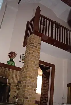To access the new master bedroom and upstairs bathroom a doorway was added at the top on the stairs at the high point of the vaulted ceiling of the former school room. A gallery at that level in the school room was created to walk through to the new rooms on that level. It is unsubstantiated but it is believed that the carved newel post forming the corner of the gallery was from a deconsecrated church in neighbouring Ashford. The former school room is the main living and dining area in the property.