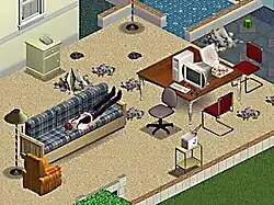 Wright has mentioned playing Little Computer People and receiving valuable feedback on The Sims from several people involved with the game including its designer, Rich Gold.[20] A demo of the game was presented at the 1999 Electronic Entertainment Expo. During a displaying in front of the press, two female characters at an in-game wedding fell in love and kissed each other. After the event, the relationship mechanics were further modified so the character's sexual orientation was set depending on the player's actions.[21] The Sims uses a combination of 3D and 2D graphics techniques. The Sims themselves are rendered in 3D, whereas the house and all its objects are pre-rendered and displayed diametrically.[14] For the game's Japanese release, the game was renamed to SimPeople (シムピープル) to match the naming conventions of the other Sim games from Maxis.[22]