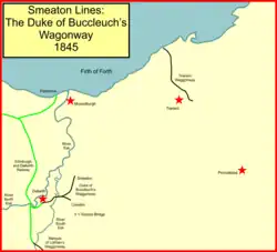 Buccleuch's tramway ran from the Dalkeith station of the Edinburgh and Dalkeith Railway, running east through the streets of Dalkeith, crossing the present day Buccleuch Street and Newmills Road diagonally to the location of the Elmfield ironworks of William Mushet. It then turned north-east to the South Esk Bridge, named Victoria Bridge; it was immediately south of the present-day Musselburgh Road bridge. The tramway then forked, running south-east to serve Cowden coalpit, and north to Smeaton Colliery (belonging to the Marquis of Lothian) and Smeaton Brick Works.[1]