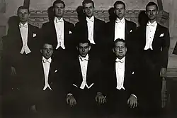 The society’s repertoire, which contains over 200 arrangements, is composed entirely of music arranged by current and former members of the group during its more than eight decades of existence. It spans a variety of genres from barbershop to jazz to songs by more contemporary artists like Queen, MIKA, Radiohead, Ariana Grande, Tenacious D, Olivia Rodrigo, Billie Eilish and Michael Bublé.[5] In addition to singing, the group prides itself on its comedy, with a typical concert including shtick written by members of the group. Each year, the Society of Orpheus and Bacchus performs across the USA and around the world, typically wearing tuxedos or suits with custom group neckties. They have performed at the White House, the Korean Demilitarized Zone, La Fortaleza in Puerto Rico, the American Airlines Arena for the NBA team the Miami Heat, as well as at country clubs, yacht clubs, churches, schools and resorts. The SOBs are one of only three groups — along with the Whiffenpoofs and Whim 'n Rhythm — that have a weekly engagement at Mory's Temple Bar.