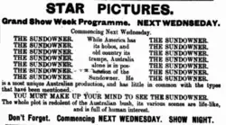 The Sundowner is a capital story of unbounded interest and excitement. The life in the Never, Never country, with its awesome loneliness and characteristic beauty, is defined throughout the lengthy picture with such incredible exactness that with small imagination the spectator is carried direct to the spot. "The Sundowner", being one of Pathe Freres' first efforts in dramatic photography in our country, particular care has been paid in making it a pronounced success. Localities were explored and carefully considered, the site of operations being ultimately found out in the far west. A company of the first rank of colonial actors was selected to assume the many characters involved, and a staff of skilled photographic operators was deputed to carefully absorb this delightful dramatic story into photographic form for presentation to the many to whom this class of picture appeals[17]