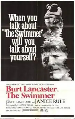 The Swimmer is a 1968 American drama film starring Burt Lancaster.[1] The film was written and directed by Academy Award-nominated husband-and-wife team of Eleanor Perry (screenplay adaptation) and Frank Perry (director). The story is based on the 1964 short story "The Swimmer" by John Cheever, which appeared in the July 18, 1964, issue of The New Yorker.[2] The 95-minute movie adds new characters and scenes consistent with those in the original 12-page short story.