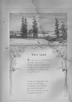 The first part of Ensign Stål was first published in the revolutionary year 1848, the second in 1860.[3][4][5] It shaped Finnish identity and was later given out free during the Winter War to raise patriotic spirit.[4] The first chapter of the poem also became the national anthem of Finland.[3]