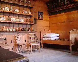 The ethnographic exhibition presents, among others, an interior of a typical 19th century Podhale cottage, with two spaces – the "white" and "black" rooms separated by a vestibule. An original entrance door decorated with diagonal wooden pegs – originally part of Stanisław Wójciak's house in Kościelisko – was purchased by the museum in 1905 and now leads to the reconstruction of the cottage. The inside of the cottage presents the way of life of 19th century Podhale families. Daily life concentrated in the ‘black’ chamber, its walls darkened by the smoke from the stove.[4]