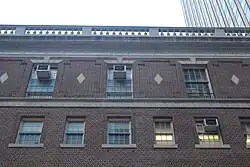 The attic contains seven double-hung sash windows, which are larger than those in the midsection.[20] Each window has an iron grille below it, as well as a limestone lintel with a keystone above.[19] There are recessed brick panels between each of the attic windows, each of which contains a limestone lozenge. Both of the outermost bays contain recessed panels with an ocular window inside. The attic contains an Adamesque limestone frieze above the windows.[20] Above this is a set of dentils and a balustrade.[19]