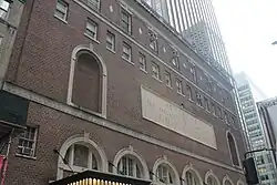 The main elevation of the facade, facing south on 43rd Street, is clad in brown brick with Flemish bond and is divided into three horizontal sections.[16] The openings have limestone trim around them.[17] Generally, the facade is nine bays wide and is designed to appear as a four-story structure.[18] When it was completed, Town Hall's facade complemented the Georgian facade of the Stephen Sondheim Theatre immediately across the street.[10]