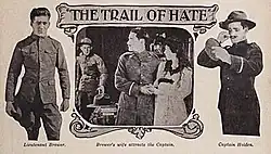 The Trail of Hate is a 1917 American silent drama film that portrayed the military exploits and personal rivalries of two United States Army officers stationed in the American West and later in the Philippines. The production starred John Ford, who at that time was credited as "Jack Ford".[b] Currently classified as a lost film, this two-reel short is identified by some biographers of John Ford and in many filmographies, both in print and online, to be his second release as a director. He is also credited in various sources for writing the film's screenplay or "scenario".[1] Other Ford biographers, however, most notably American director and film historian Peter Bogdanovich, credit this production's screenplay and its direction to John's older brother Francis Ford.[2][c]