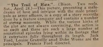 - ^ "THE TRAIL OF HATE (Bison)", The Moving Picture World, April 28, 1917, p. 640. Internet Archive. Retrieved April 25, 2020.