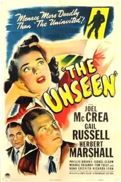 The Unseen is a 1945 American horror mystery film directed by Lewis Allen and starring Joel McCrea. It's based on the 1942 novel Midnight House (US title: Her Heart in Her Throat) by Ethel Lina White.