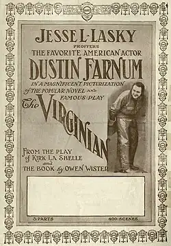 The Virginian is a 1914 American silent Western film[1] based on the 1902 novel The Virginian by Owen Wister. The film was adapted from the successful 1903–04 theatre play The Virginian, on which Wister had collaborated with playwright Kirke La Shelle. The Virginian starred Dustin Farnum in the title role, a role he reprised from the original play.[2] It was directed by Cecil B. DeMille.