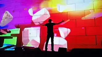 Roger Waters and a cast of supporting musicians ... perform[ed] from start to finish one of the most commercially successful, beloved and ambitious art-rock albums in history ... as the show begins, the famous and enormous white wall is erected on stage, brick by brick, until it obscures the band and becomes a screen upon which a dazzling array of videos and visuals are projected. Technically, this was a nearly flawless show. The sound was clean and true. The original album and tour was about isolation. This time around, it was more anti-war, anti-capitalism and anti-poverty than about any kind of psychological issue. In addition to wild and slightly creepy animations from Gerald Scarfe, projections on the wall and video screens showed images of poverty, soldiers and others who died in conflicts as well as video of planes bombing areas with crosses, dollar signs, Shell Oil logos and others.[23]