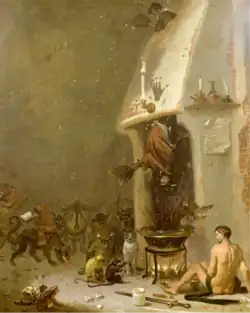 This artwork has a different character than the other five paintings in the series, lacking the conflict between humans and the world of magic.[21] Instead, Goya emphasizes a world that combines animalistic traits with those typically attributed to humans in a single being.[22] In the kitchen, there are four figures of witches or wizards, whose gender is difficult to determine. On the ground lie a smoking bowl and jug, a bottle, and two human skulls. Above them hang bones, skulls, and an oil lamp that illuminates the scene. A black goat riding a broom flies out through a chimney over the hearth. One witch looking at it has the head, tail, and one leg of a dog. The one who is hunched down on the floor, reaching into the jug, has the face of an old witch and one animal leg.[21] These witches are in the process of transforming into animals[23] thanks to the magical ointments they are applying.[24] The third figure has a skull-like head with dark, sunken eye sockets. The last figure, turned away from the viewer, is urinating.[21] According to another interpretation, these two figures seen on the left side of the composition were conjured by the witch and transformed into demons.[25]