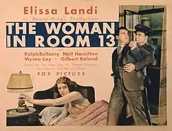 The Woman in Room 13 is a 1932 American pre-Code mystery film directed by Henry King and adapted by Guy Bolton from the play of the same name. The film stars Elissa Landi, Ralph Bellamy, Neil Hamilton, Myrna Loy, Gilbert Roland and Walter Walker. The film was released on May 15, 1932, by Fox Film Corporation.