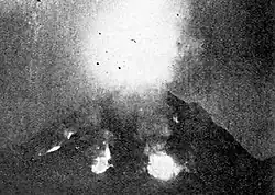 On 12 January 1914, a volcano erupted on the island of Sakura-Jima in Kagoshima prefecture, in the southern part of Japan. It was one of the biggest disasters in the history of Japan. Producer Thomas H. Ince immediately decided to make a film based on the incident. The Toledo Blade reported on 24 January 1914 that "News of the eruption was hardly a day old before Mr. Ince had built in Santa Monica canyon a whole Japanese village".[1] Ince had constructed a very large village in his studio Inceville in Culver City, California, and decided, where possible, to use Japanese people instead of Americans as extras. He gathered workers from the Southern California who were to work as peasants in the film.[1][2] Approximately 1,000, mostly Japanese, extras were used. The film's shooting began on 27 January 1914, just 15 days after the eruption ceased. Actress Enid Markey was "badly injured" during the production; during her scene in which the lava flow destroys the village she was surrounded by smoke and fumes and nearly asphyxiated, but had recovered by May 1914.[3][4] Six reels were used to film it in total.[5][6]