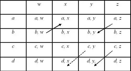 Consider two natural attributes A, and X. It is not known that either A or X is a continuous quantity, or that both of them are. Let a, b, and c represent three independent, identifiable levels of A; and let x, y and z represent three independent, identifiable levels of X. A third attribute, P, consists of the nine ordered pairs of levels of A and X. That is, (a, x), (b, y),..., (c, z) (see Figure 1). The quantification of A, X and P depends upon the behaviour of the relation holding upon the levels of P. These relations are presented as axioms in the theory of conjoint measurement.