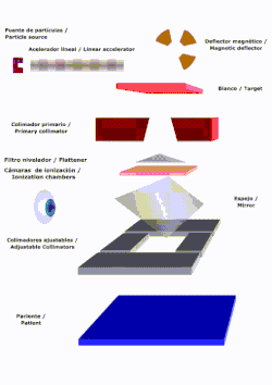The patient is placed on a fixed stretcher. Above them is a turntable to which the components that modify the electron beam are fixed. The turntable has a position for the X-ray mode (photons), another position for the electron mode and a third position for making adjustments using visible light. In this position an electron beam is not expected, and a light that is reflected in a stainless steel mirror simulates the beam. In this position there is no ion chamber acting as a radiation dosimeter because the radiation beam is not expected to function.