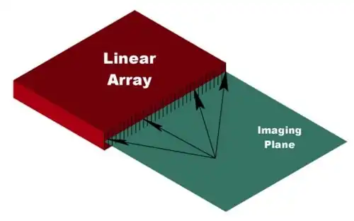 Linear transducer arrays (both curved and straight) are commonly used in conventional medical ultrasound. They are available in a wide variety of sizes and shapes.[2] They are easily adapted for use in thermoacoustic imaging. Figure 7 illustrates how a linear array is used for 2D thermoacoustic imaging. The array consists of a number of elements (64 - 256) that are focused in the vertical dimension to maintain maximum sensitivity within a 2D plane extending outward from the front face of the array. Thermoacoustic signals within the plane are localized by calculating the times-of-flight from each position within the plane to each element of the array (arrows, Fig. 7).[20][3]