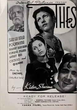 A distinctive feature of Thes was the ensemble used in the film. Shashikala, the female lead for Thes, would go on to act in over a hundred films in her career spanning around six decades,[6] eventually getting the Padma Shri, one of India's highest civilian awards.[7][8] Purnima, who would go on to act in a majority of films by Varma Films, was praised by Filmindia, one of the most popular magazines of its time,[9] for her promising role in Thes.[10] Also noteworthy was that the filmmakers of Thes not only used the same director, Kidar Sharma, of their recent hit film Suhaag Raat, but also used other members of Suhaag Raat’s ensemble to create a template for success. Like in Suhaag Raat, the lead male actor of Suhaag Raat, Bharat Bhushan, played the lead role in Thes. Further, the music of Thes was composed by Snehal Bhatkar, the same person who had composed the music of Suhaag Raat.[11] Finally, as with Suhaag Raat, Thes was produced by Kidar Sharma and Munshiram Varma.[12]