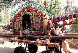 Nandi kalyanam, the celestial wedding of the Nandi (bull), is celebrated in a grand manner in this temple during the Tamil month of Panguni (mid-March to mid-April). At that time Lord Nandeeswara, the bridegroom of Aiyarappar temple marries Goddess Swayambikai of Thirumazhapadi and is brought in a palanquin. He is accorded a reception by the presiding deity of the temple Vaidyanathasami.[6]