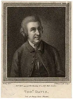 Thomas Davies (c. 1713 – 1785) was a Scottish bookseller and author. He studied at the University of Edinburgh, and was for some years on the stage, but having been ridiculed by Churchill in The Rosciad, Davies gave up acting and opened a bookshop in Covent Garden. It was here that in 1763 he introduced Boswell to Dr. Johnson, who was Davies' close friend, and to whom he dedicated his edition of the works of Massinger. Davies wrote a successful Life of Garrick (1780), which passed through four editions, and Dramatic Miscellanies (three volumes, 1783–84).