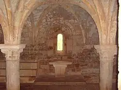 The Chapter House, or The Capitulary Hall, was the room where the monks met daily for a reading of one chapter of the rule of St. Benedict, and to discuss community issues. Election of new abbots also took place in this room. Its architecture - with cross-ribbed vaults resting on two columns with decorated capitals, was the most refined in the monastery, and showed the influence of the new Gothic style. The walls and columns date to about 1170, the vaulting to 1200-1240.