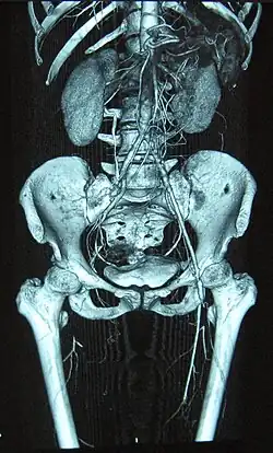 Angiograms of the upper and lower extremities can be helpful in making the diagnosis of Buerger's disease. In the proper clinical setting, certain angiographic findings are diagnostic of Buerger's. These findings include a "corkscrew" appearance of arteries that result from vascular damage, particularly the arteries in the region of the wrists and ankles. Collateral circulation gives "tree root" or "spider leg" appearance.[1] Angiograms may also show occlusions (blockages) or stenosis (narrowings) in multiple areas of both the arms and legs. Distal plethysmography also yields useful information about circulatory status in digits. To rule out other forms of vasculitis (by excluding involvement of vascular regions atypical for Buerger's), it is sometimes necessary to perform angiograms of other body regions (e.g., a mesenteric angiogram).