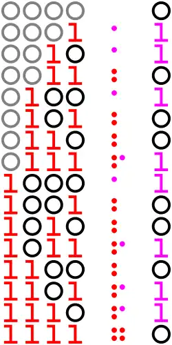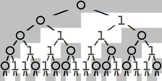 In mathematics, the Thue–Morse or Prouhet–Thue–Morse sequence is the binary sequence (an infinite sequence of 0s and 1s) that can be obtained by starting with 0 and successively appending the Boolean complement of the sequence obtained thus far.[1] It is sometimes called the fair share sequence because of its applications to fair division or parity sequence. The first few steps of this procedure yield the strings 0, 01, 0110, 01101001, 0110100110010110, and so on, which are the prefixes of the Thue–Morse sequence. The full sequence begins: