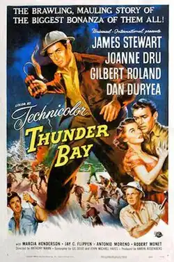 Thunder Bay is a 1953 American adventure film distributed by Universal International, produced by Aaron Rosenberg, directed by Anthony Mann, and starring James Stewart, Joanne Dru, Gilbert Roland, and Dan Duryea. It was shot in Technicolor and was released on May 20, 1953 which was James Stewart's 45th birthday. This film tells the story of two engineers drilling for oil in the Louisiana gulf while dealing with hostility of the local shrimp fishermen fearing for their livelihood, and features the first non-western collaboration between Stewart and Mann.