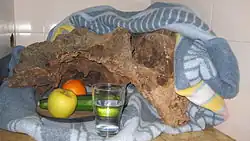 Beginning with the Feast of the Immaculate Conception (December 8), one gives the tió a little bit to "eat" every night and usually covers him with a blanket so that he will not be cold. The story goes that in the days preceding Christmas, children must take good care of the log, keeping it warm and feeding it, so that it will defecate presents on Christmas Day or Eve.[4]