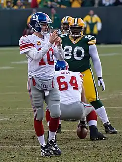 New York Giants quarterback Eli Manning calls for a time-out during a 2011 National Football League game.