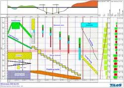 In project management, a time–distance diagram (also called time-chainage diagram, time–distance chart, time-chainage chart, time–location diagram, time-location chart, March chart, location–time chart, orthogonal diagram, line of balance chart,[4] linear schedule or horse blanket diagram[5]), is a method of graphically presenting a time schedule for all types of longitudinal projects such as pipeline, rail, bridge, tunnel, road, and transmission line construction.