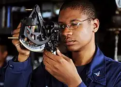- A stadimeter, a type of optical rangefinder, is an optical device for estimating the range to an object of known height by measuring the angle between the top and bottom of the object as observed at the device. It is similar to a sextant, in that the device is using mirrors to measure an angle between two objects but differs in that one dials in the height of the object. The stadimeter was invented in 1894 by Bradley Allen Fiske, a Rear-Admiral in the United States Navy.[41] The first sea tests, conducted in 1895, showed that it was equally useful for fleet sailing and for navigation.[42] Likewise, the stadimeter proved useful during the Battle of Manila Bay during the Spanish–American War. U.S. patent #523,721 was issued to Fiske on July 31, 1894.[43]