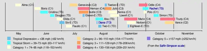 The season produced twenty-seven tropical depressions, of which twenty-one became named storms, and sixteen strengthened into hurricanes. Six out of the sixteen hurricanes strengthened into major hurricanes.[nb 1] Despite high levels of activity, Rachel was the only system to make landfall, bringing floods to Northwestern Mexico and the Southwestern United States.[1] Thousands were left homeless, and there were 18 confirmed fatalities.[4] Additionally, the remnants of Hurricane Boris brought light showers to California. At that time, Hurricane Hernan was the strongest Pacific hurricane to have its intensity estimated via satellite imagery; this record was matched by Hurricane Trudy months later.[1] One tropical storm formed in the Central Pacific Hurricane Center's warning zone and eventually crossed the International Dateline before dissipating.[5]